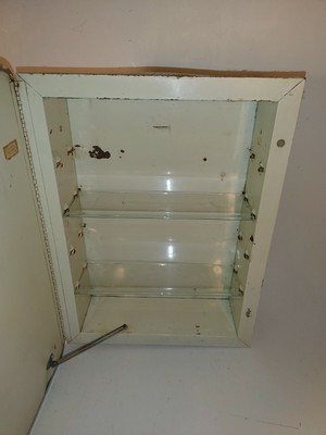 Vintage medicine cabinet used for displaying antique toiletries and bottles. Good Vintage Condition missing 2 glass shelves and left side light glass minor surface rust solid steel brass fittings - Cabinet frame 59 h x 18 w x 15 12 d drawer - 14 12 d x 15 12 w Storage cabinet - 15 12 d x 19 12 w x 11 12 h Function. Barfly vintage medicine cabinet white high gloss finish with mirror and complete with glass shelves inside.